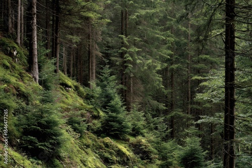 © Achaa, Obraz premium Dense, mossy forest slope. Lush green conifers fill the scene, sloping upward