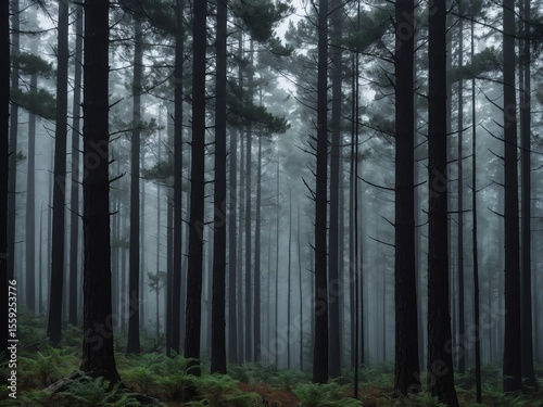 Fototapeta premium Dense pine forest enveloped in morning fog