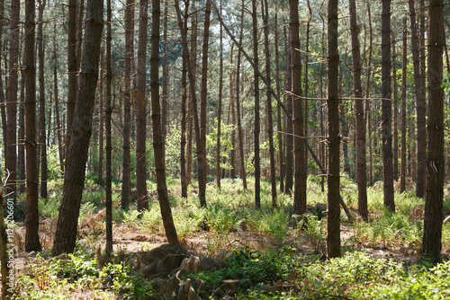Fototapeta premium Dense pine forest floor, sunlight filtering through trees. Green undergrowth.