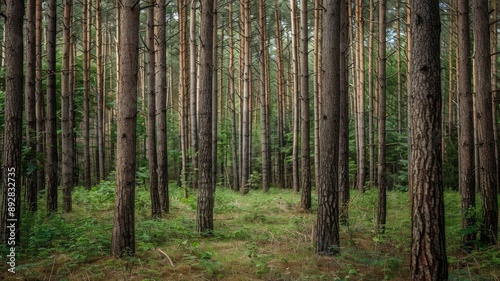 © Artyom, Obraz premium Dense pine forest with lush green undergrowth