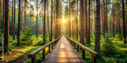 © lapeepon, Obraz premium Dense pine forest with tall trees and underbrush, sunlight filtering through canopy leaves