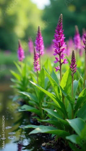Obraz premium Dense purple loosestrife overtaking wetland vegetation, native plants,...
