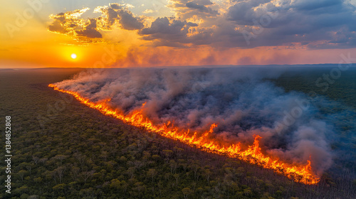 © sainan, Fototapeta premium dense rainforest is engulfed in flames, with thick smoke billowing into sky as sun sets in background, creating dramatic and somber atmosphere