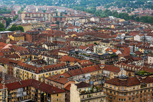Fototapeta premium Dense residential cityscape of Torino, Italy with red tiled roofs and...