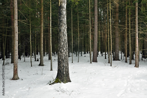 Fototapeta premium Dense spruce forest in winter. The trunks of the trees among the snow.