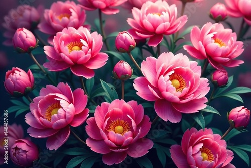 © Pada, Fototapeta premium Dense, stylized peony blossoms in vibrant hues, endlessly repeating , surface, peony pattern