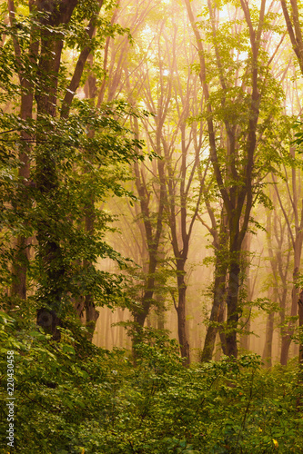 © Volodymyr, Obraz premium Dense trees in the woods in the mist during the sunrise_