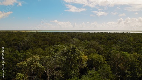 Obraz premium Dense tropical forest stretches toward a blue cenote lagoon in Tulum Mexico.