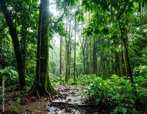 © Abbas, Obraz premium Dense tropical forest trees sunlight path verdant landscape natural environment