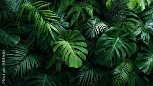 Fototapeta premium Dense tropical green leaves forming a lush natural background with rich...
