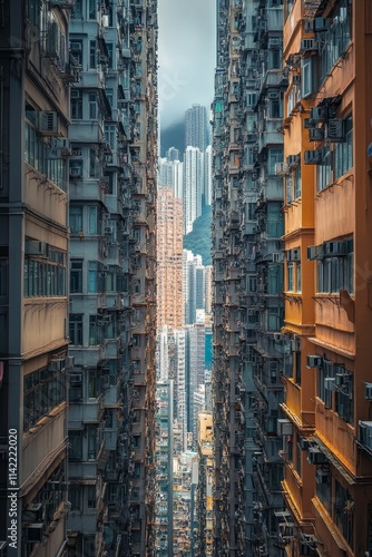 Fototapeta premium Dense urban buildings, narrow alley, many windows.