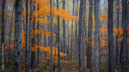 Fototapeta premium Dense woodland during autumn, sunlight filtering through orange leaves,...