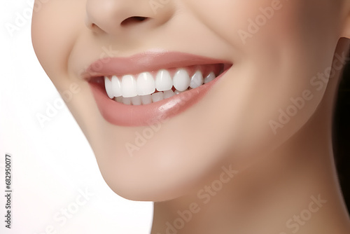 © mica, Fototapeta premium Dental ad banner for tooth whitening services, dentist, advertising. Woman smiling closeup. Dental care concept