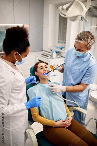Obraz premium Dental assistant using ultraviolet lamp during dental procedure of female...