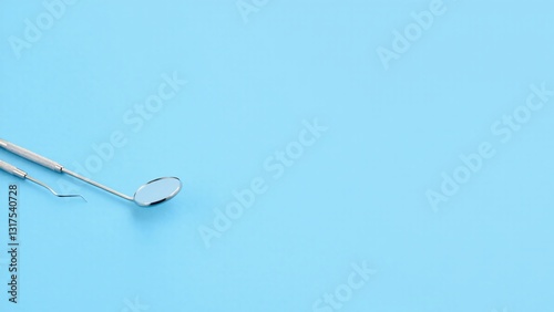 © Thunder, Fototapeta premium Dental hygiene tools, including a mirror and probe, isolated on a light blue background.