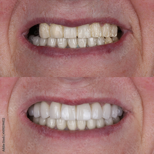© UniqDream, Fototapeta premium Dental implant treatment with oral surgery. Treatment of tooth loss. Porcelain dental prosthesis placed on implants embedded in the jawbone. Dental before after and smile makeover.