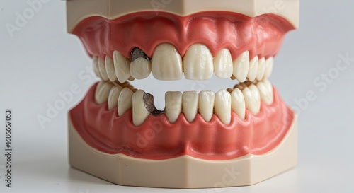 Obraz premium Dental model shows artificial teeth with some silver dental work in a pink gumline