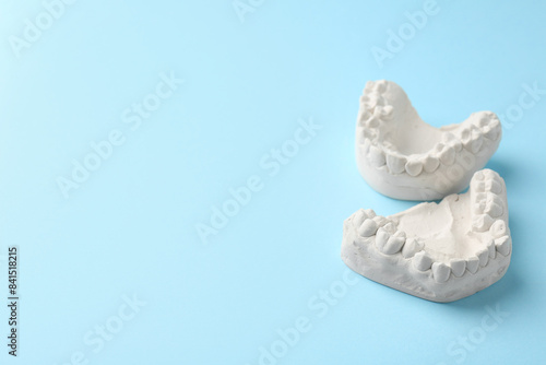 Obraz premium Dental model with gums on light blue background, space for text. Cast of teeth