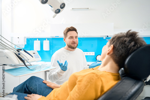 Obraz premium Dental practitioner explaining to client ways of tooth infection treatment