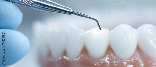© Phlegmatic Tigress, Fototapeta premium Dental probe examining teeth, close-up of dentist hand in glove with periodontal tool and white tooth model, medical background, no people