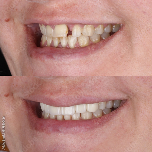 © UniqDream, Fototapeta premium Dental treatment in dentistry. Smile design treatment with dental design. New tooth design with porcelain crowns. Full arch dental treatment. Dental before after and smile makeover.