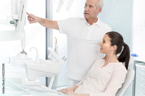 Fototapeta premium Dentist discussing x-ray reult of patient teeth in clinic