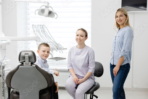 Obraz premium Dentist explaining dental hygiene to mother and child in clinic