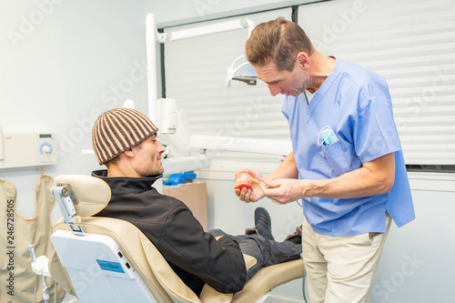 © PhotoSpirit, Obraz premium Dentist explains to patient on teeth mockup