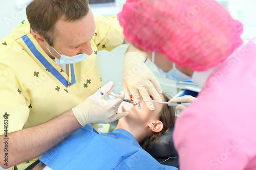 © Pavel Losevsky, Obraz premium Dentist makes injection to girl sitting in chair