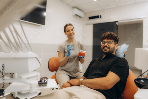 © Roman, Fototapeta premium Dentist showing teeth model to patient in modern clinic
