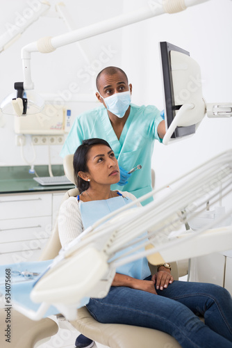 © JackF, Obraz premium Dentist showing X-ray to patient in clinic