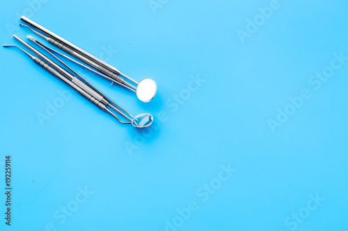 Fototapeta premium Dentist tools. Teethcare, dental health concept. Blue background top view...