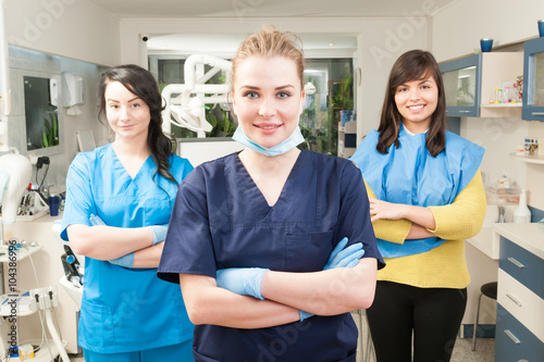 © Catalin Pop, Obraz premium Dentist with crossed arms with patient and assistant behind her