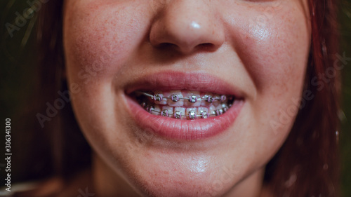 © Sergi, Fototapeta premium Dentistry concept. Smiling brunette girl with braces in her mouth.