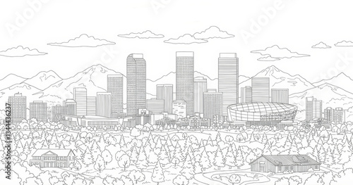 © Nima, Naklejka premium Denver City Skyline Illustration - A detailed line drawing of the Denver skyline, featuring mountains and greenery. Perfect for coloring books or city guides