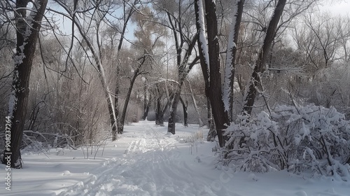 © Serhii, Obraz premium Denver Snow. Peaceful Winter Walk in Snowy Forest Landscape