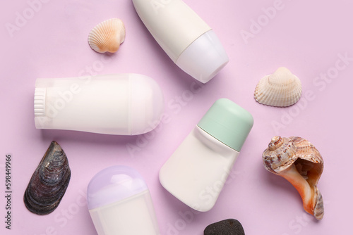 Obraz premium Deodorants with shells on pink background