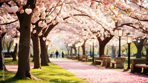 © Farhan, Naklejka premium Depict a romantic park scene in springtime, with cherry blossoms in full bloom and heart-shaped lanterns hanging from the trees. Include a gentle, pastel color palette and soft lighting to create a dr