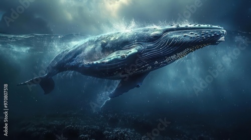 Naklejka premium depicts a majestic blue whale gracefully swimming through the deep ocean,