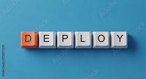 © Aimo Studio, Obraz premium Deploy message spelled out with computer keys on a blue background for software development concepts
