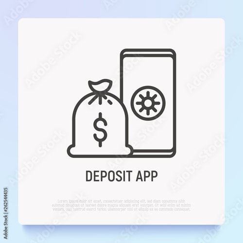 © AlexBlogoodf, Naklejka premium Deposit app thin line icon: bag with money on smartphone. Modern vector illustration.
