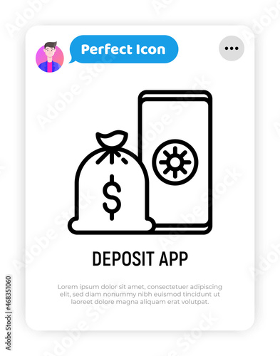 © AlexBlogoodf, Naklejka premium Deposit app thin line icon: bag with money on smartphone. Modern vector illustration.