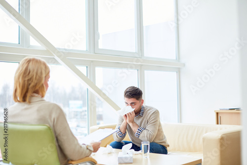 Obraz premium Depressed man sitting on sofa in light room and having talk with professional...