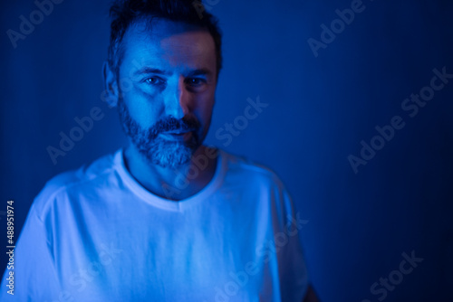 Naklejka premium Depressed mature man, alone in darkness, looking at camera, mental health concept.