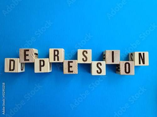 © Nadzeya, Obraz premium Depression written with wooden cubes on table