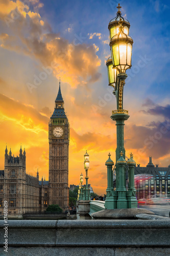 © moofushi, Naklejka premium Der Big Ben in London nach Sonnenuntergang mit Straßen Beleuchtung