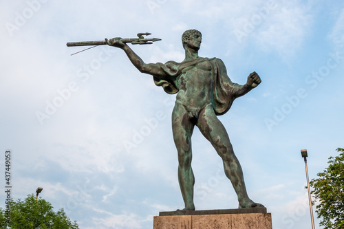 Fototapeta premium Der Blitzeschleuderer, Plastik von 1926, vor der Arena in Düsseldorf