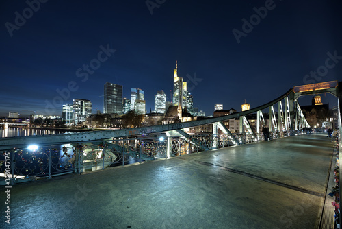 © Fotolla, Obraz premium Der eiserne Steg in Frankfurt mit den Hochhäuser in der Nacht