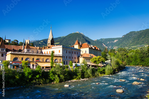 Fototapeta premium Der Fluss Passer durch Meran in Südtirol, mit Stadt und Bergpanorama im...