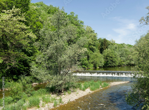 Fototapeta premium Der Fluss Wiese zwischen Lörrach im Südschwarzwald und Basel im Schweiz. Dichte Vegetation, Naturraum, Hecken und Feldgehölzen